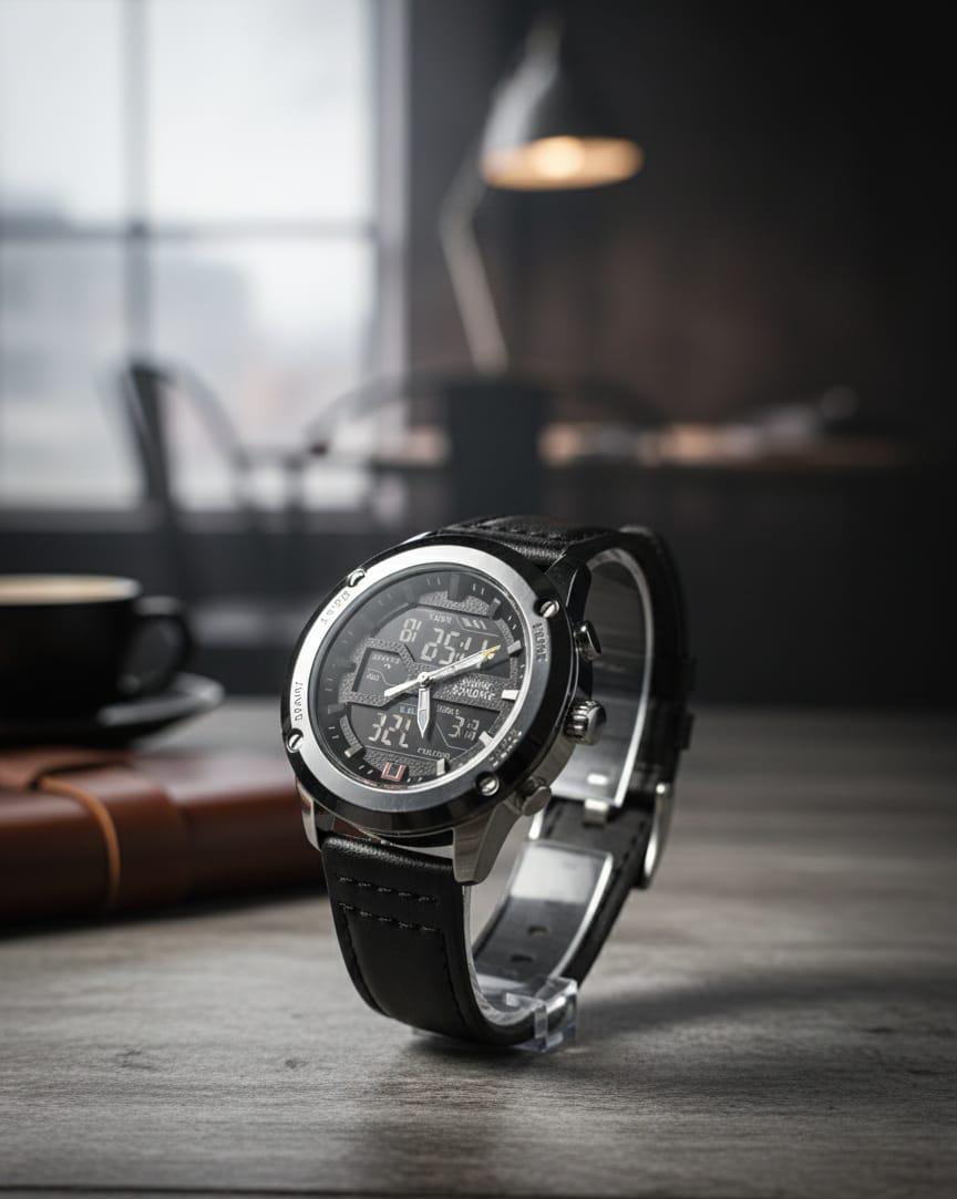 This watch has a bold black strap and black dial. Looks simple, strong, and stylish. Perfect for every day and every outfit