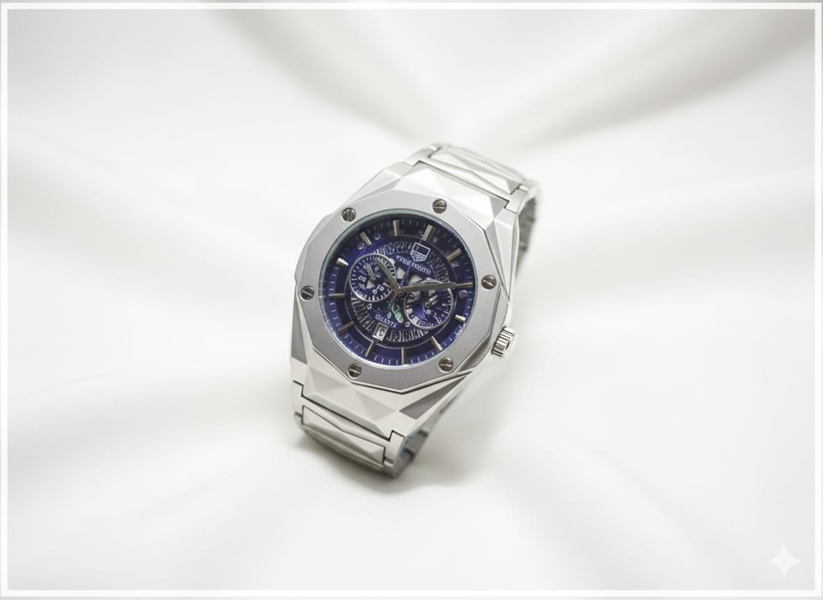 This watch has a clean white face with shiny silver steel. It looks modern and stylish. Strong and easy to wear every day.